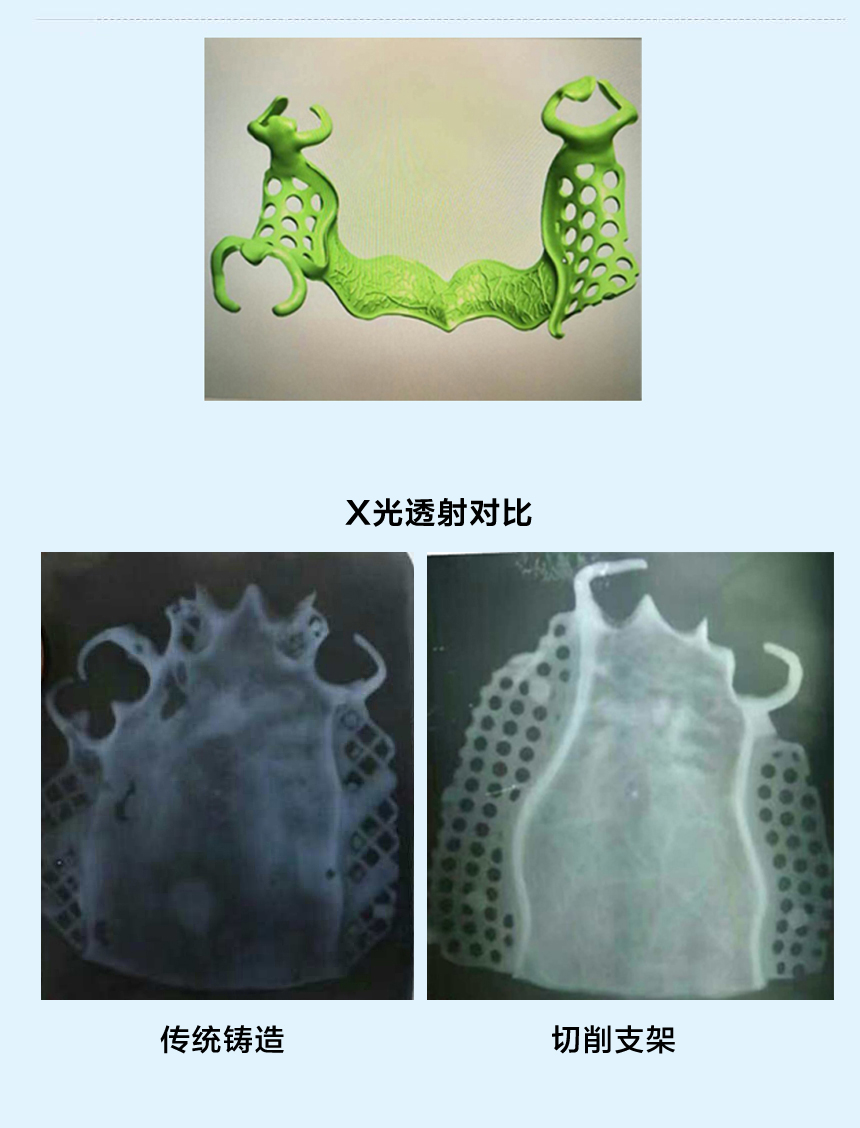 五轴设备切削纯钛支架,支架设计由计算机确定观测线,固位和就位同时得到保障,告别手工制作,使支架精确度和密合度更高;CNC切削加工出来的纯钛支架外观精美,精雕细琢的轮廓,比铸造出来的产品更加适配,在X光透射下产品均匀无暇疵,弹性和韧性优于铸造支架和3D打印,轻巧美观,患者佩戴舒适。